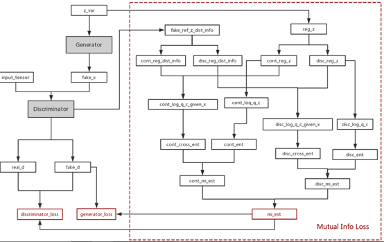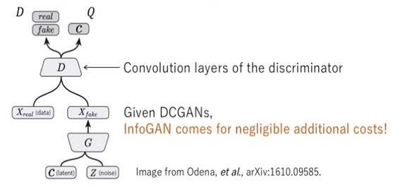 给生成器输入隐含编码c和噪声z,生成假的数据,从假数据和真实数据中随机采样,输入给定D进行判断,是真还是假。Q通过与D共享卷积层,可以减少计算花销。在这里,Q是一个变分分布,在神经网络中直接最大化,Q也可以视作一个判别器,输出类别c。