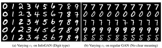 通过实验发现,c1可以作为一个分类器,分类的错误率为5%,图片a中第二行将7识别为9,但是不是意味着c1的0-9分别代表着生成数字的0-9,这是为了可视化效果,对数据重新排序的结果。如果在常规的GAN模型中添加c1编码,发现生成的图片与c1没有明显的关联。