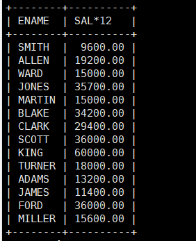 MariaDB [powernode]> select ENAME ,SAL*12 from EMP;