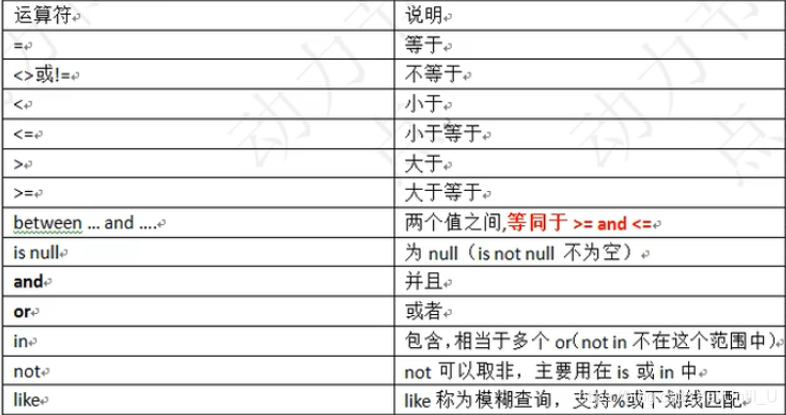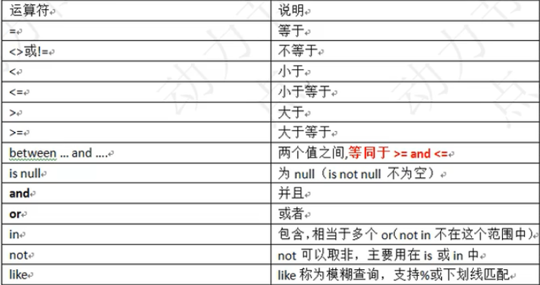 1、条件查询使用where语句,运算符如下所示: