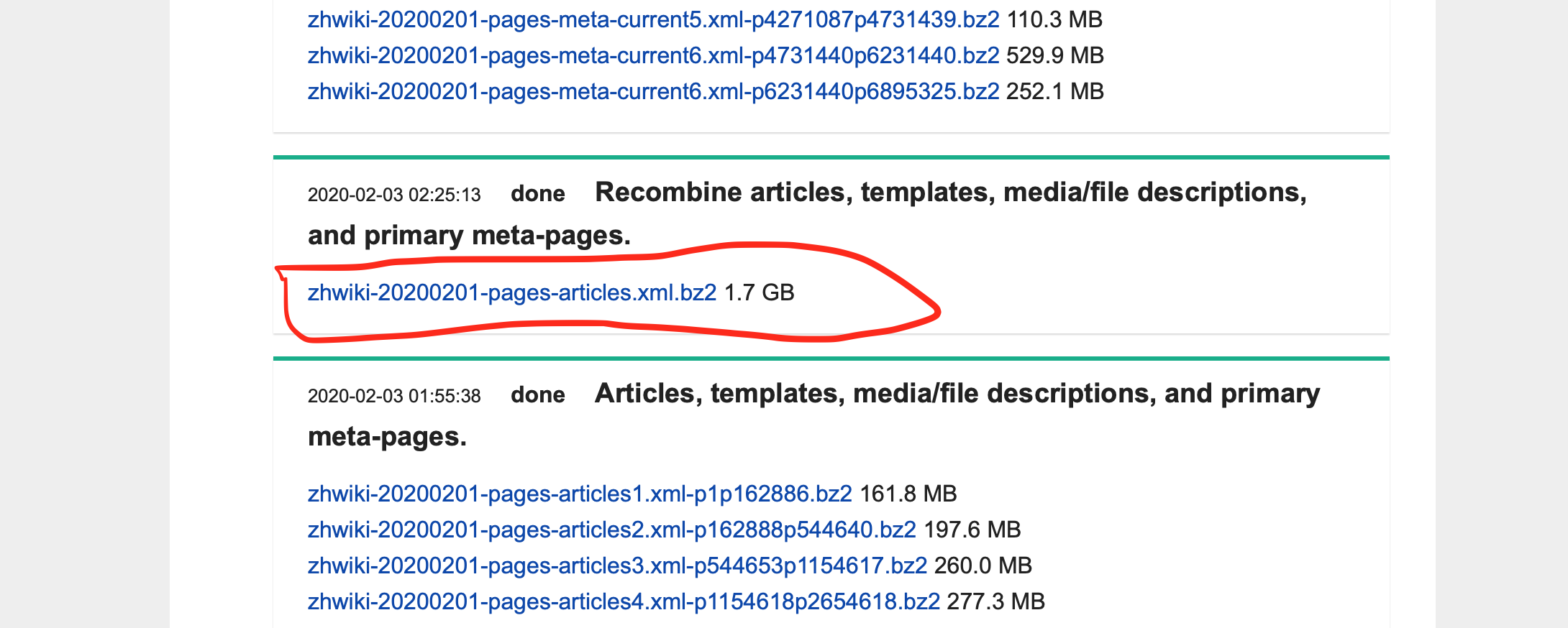 下载的是红色圈中的文件:zhwiki-20200201-pages-articles.xml.bz2