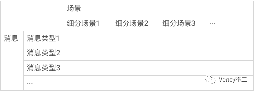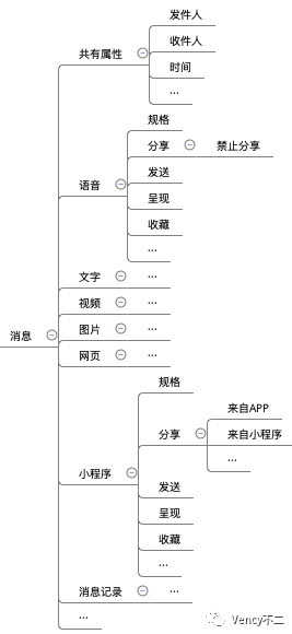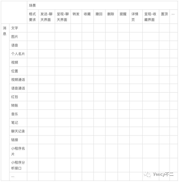 仍然以某款IM工具为例(其实就是微信)向大家讲解纵横思维的具体使用。假设要梳理微信的消息相关功能,而微信中涉及到的消息种类太多且各有不同,直接发散会导致重要功能遗漏,此时就可使用纵横思维。