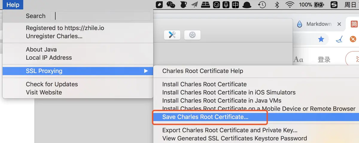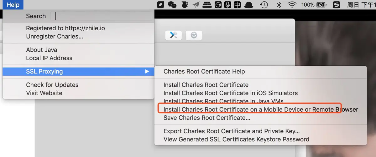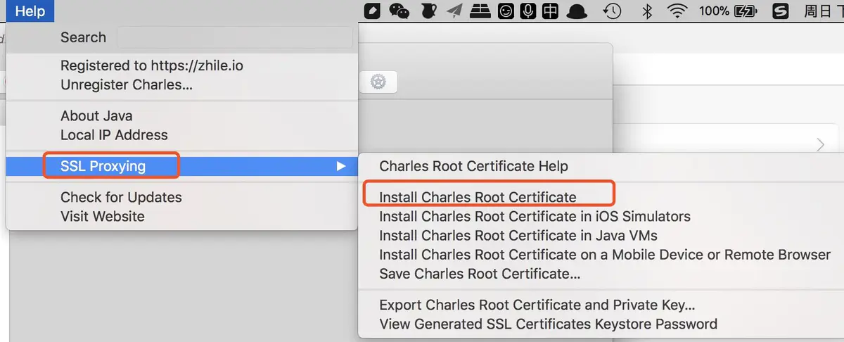 1、Help --> SSL Proxying --> install Charles Root Certificate,首先在mac安装CA证书。