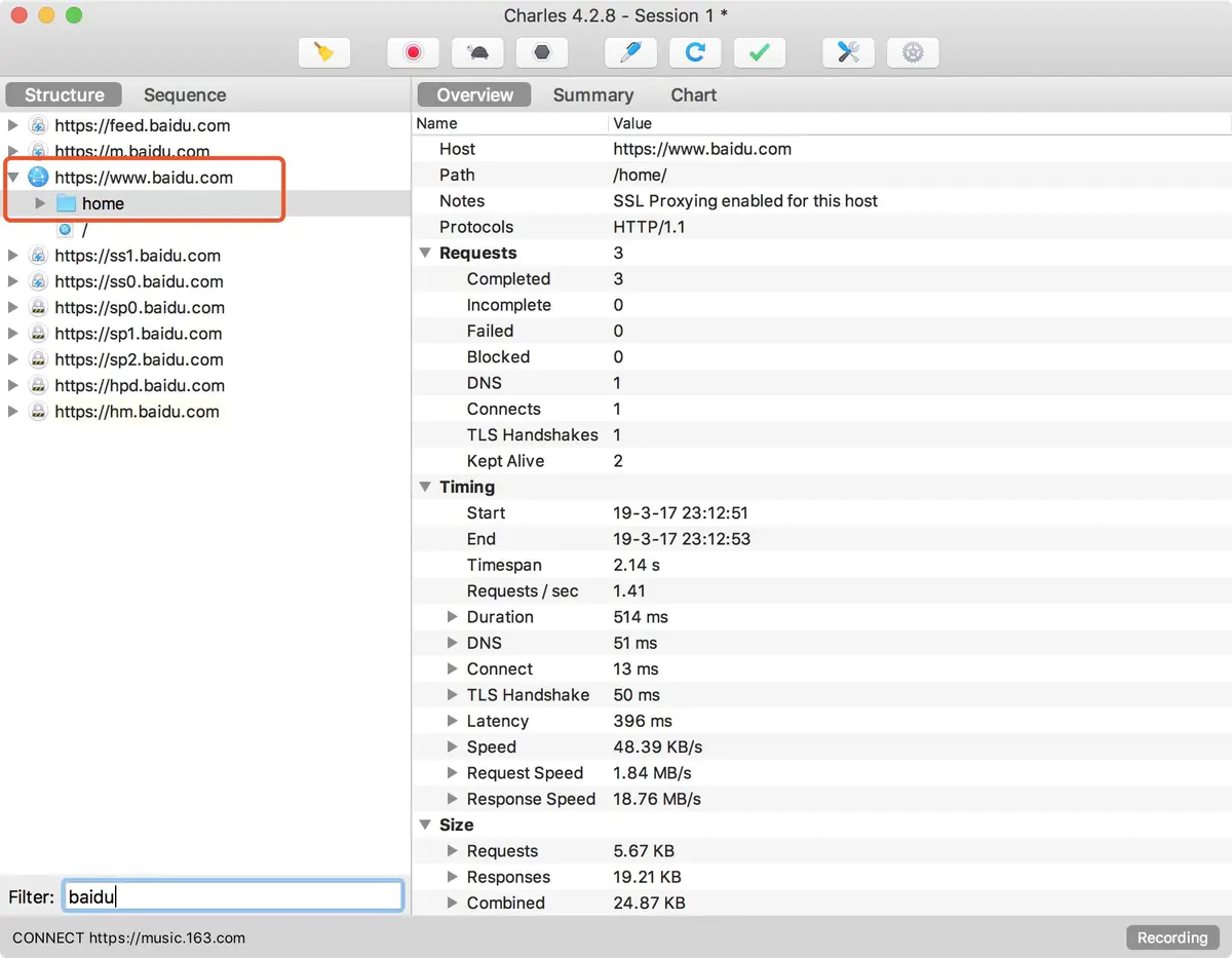 3、此时,用电脑访问百度,就已经可以获取访问的包了,如果我们需要监听手机的访问,就还得在手机上进行设置。