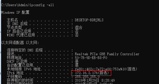 cmd命令行输入ipconfig -all,查看电脑当前ip地址
