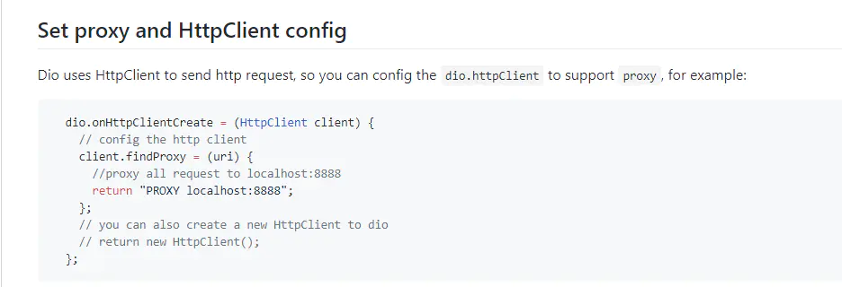 我的flutter应用程序中,网络请求使用的 dio 框架。经查阅dio的文档,发现可以设置http代理。