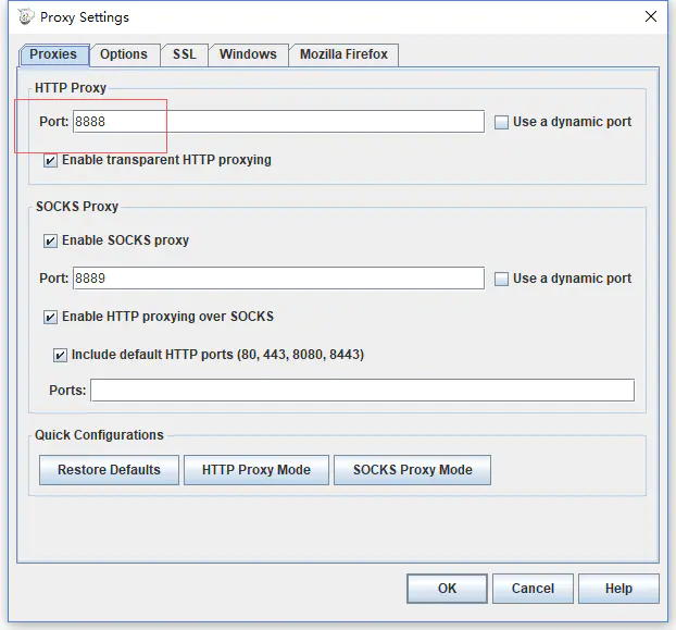 2、Proxy --> Proxy Settings 设置监听端口号为8888。