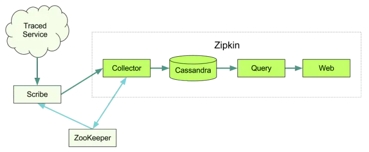 如图所示,Zipkin 主要由四部分构成:收集器、数据存储、查询以及 Web 界面。Zipkin 的收集器负责将各系统报告过来的追踪数据进行接收;而数据存储默认使用 Cassandra,也可以替换为 MySQL;查询服务用来向其他服务提供数据查询的能力,而 Web 服务是官方默认提供的一个图形用户界面。