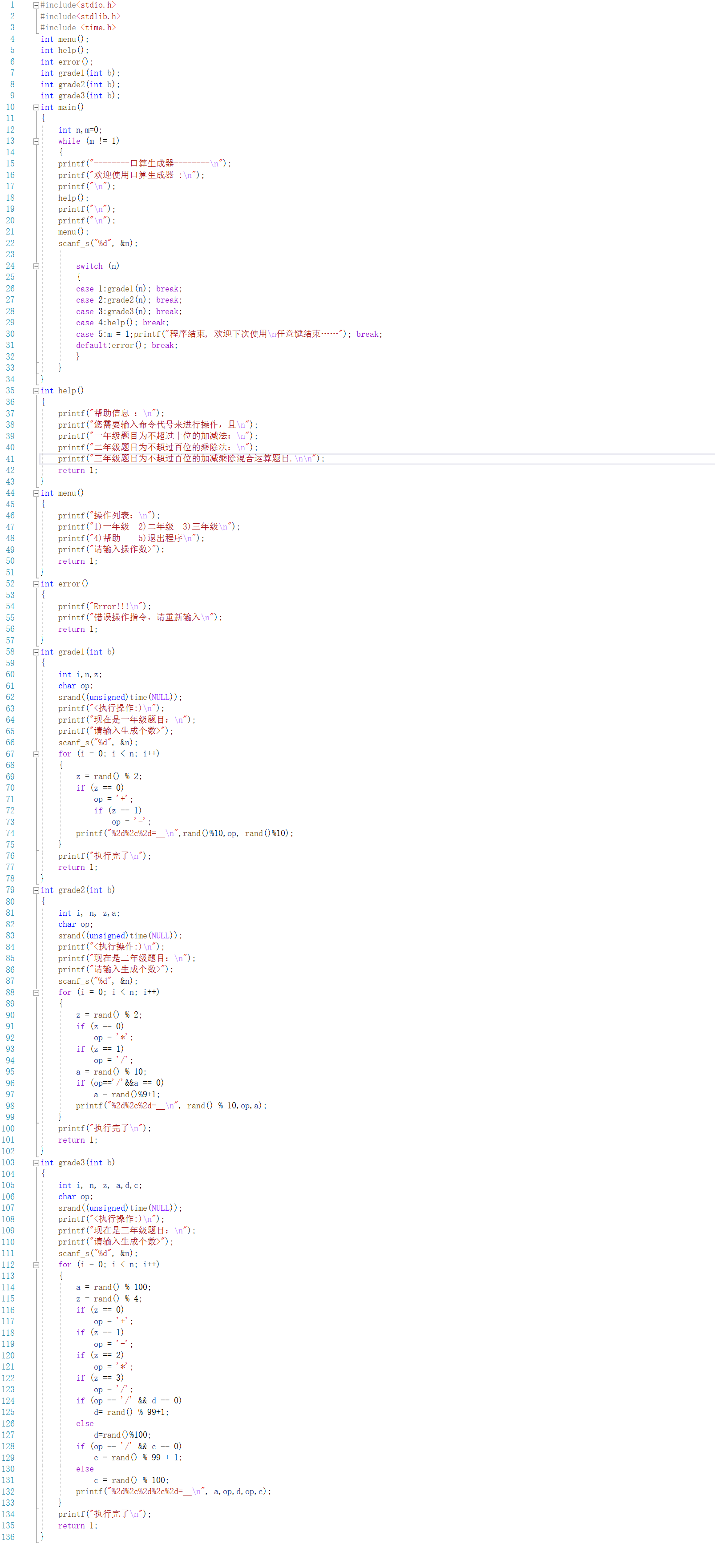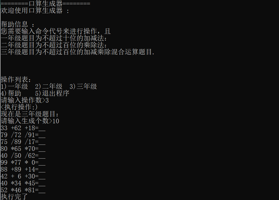 设计思路:运用随机数来实现题目和加减乘除符号(关于加减乘除符号的随机生成我使用了0~4之内的随机数的输出并借if来判断每个数所输出的对应符号)的随机生成;且在除法运算中被除数不能为0,所以此处需用if来进行判断,如果被除数为0,则重新生成一个随机数。