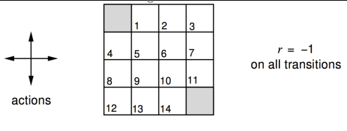 - 随机扔到一个格子,采用最少的步骤到达两个灰色的格子中,所以每一步的奖励设置-1,终止状态奖励0