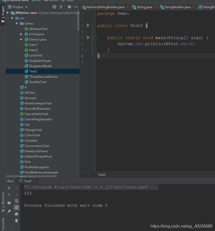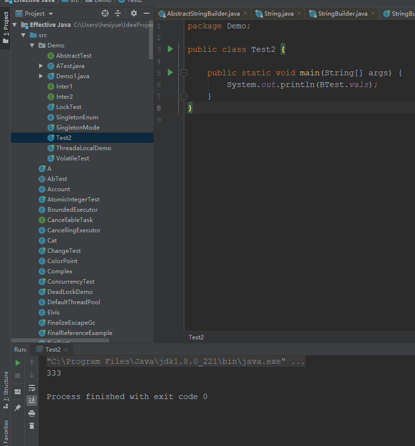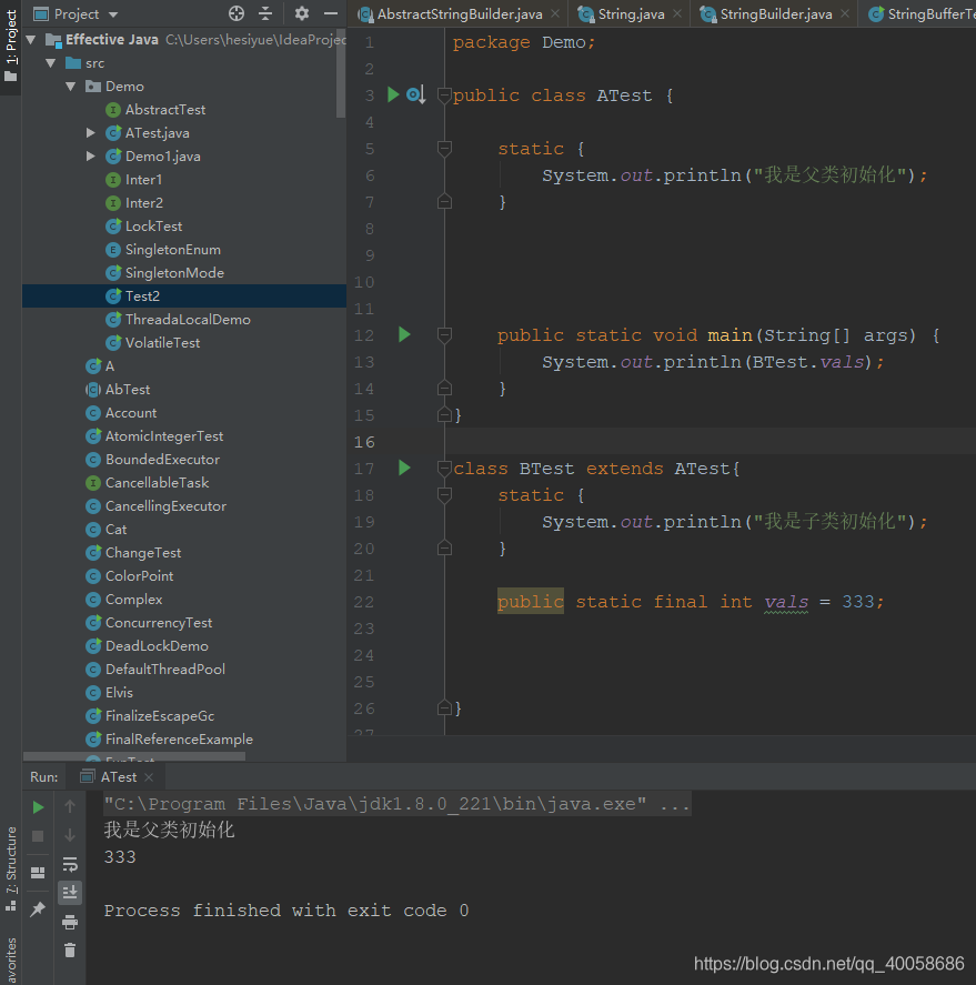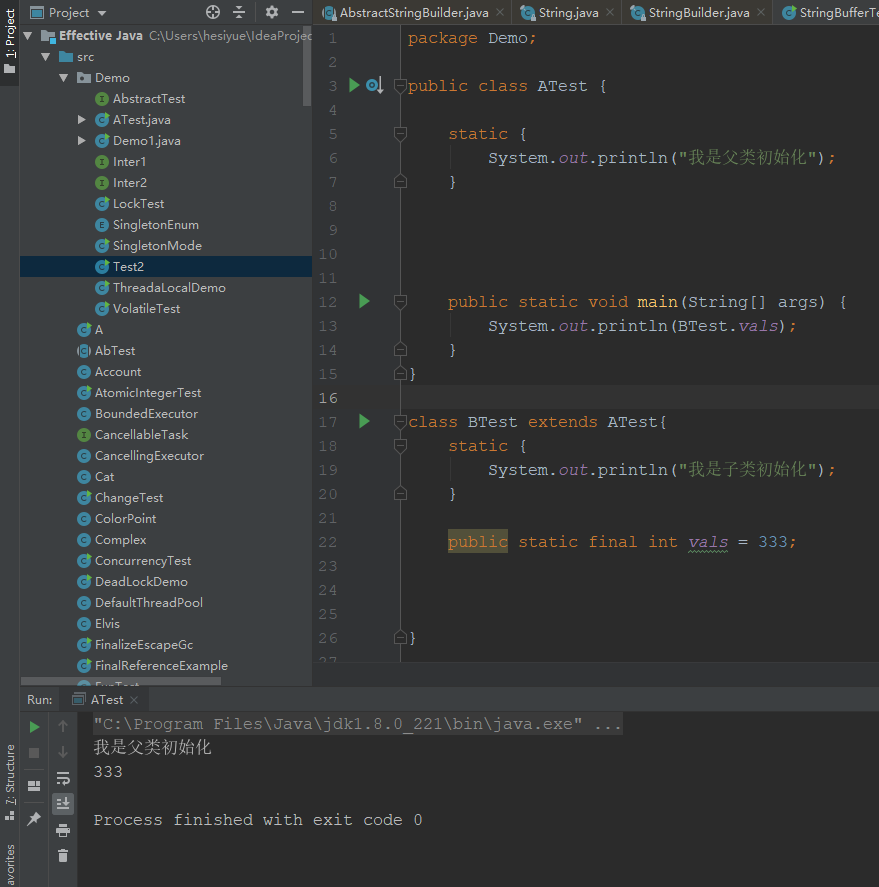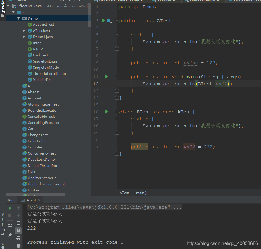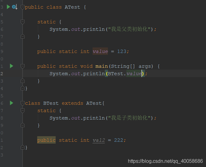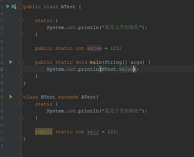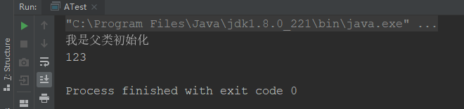因为这里满足了(4),注意main方法是在ATest类中的,所以虚拟机启动时就会初始化一个执行的主类。改成下面这样就不会了,我们把main方法写到另一个类中:
