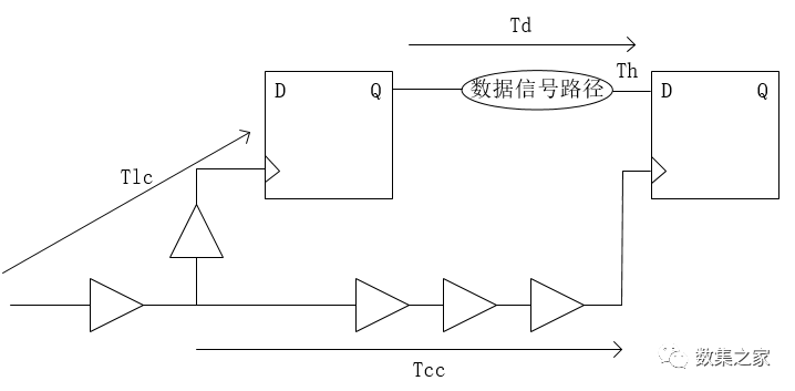 其中Tlc为发射时钟最快路径延时,Td为最快数据路径延时,Th为捕获时序单元的保持时间要求值,Tcc为最慢捕获时钟路径延时。