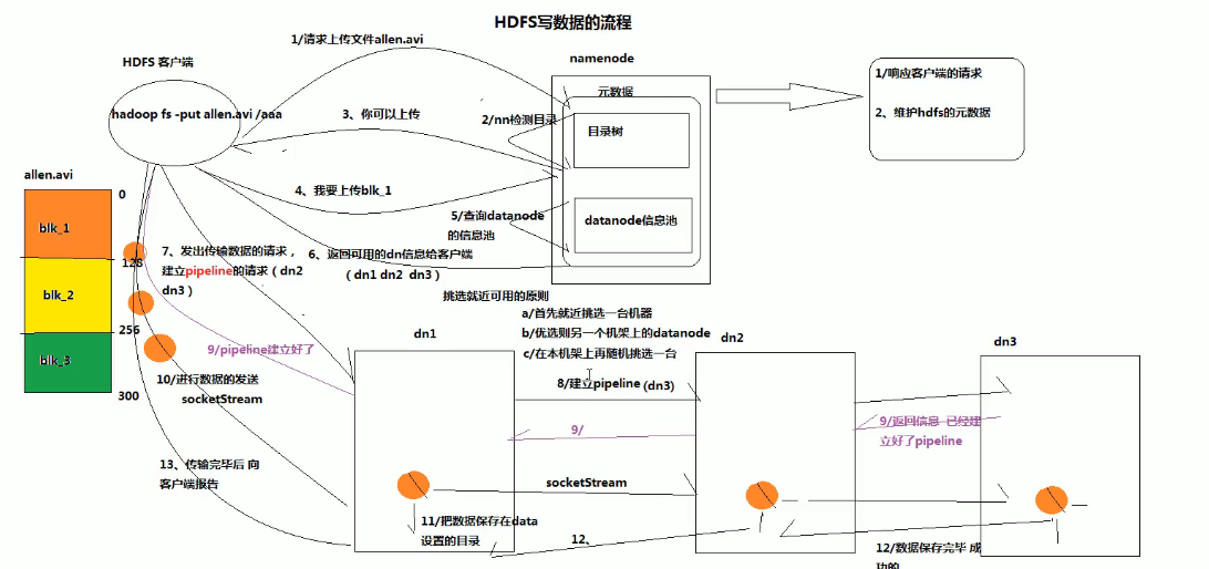 相应datanode,并由接收到blocak的datanode负责向其他datanode复制blocak的副本。