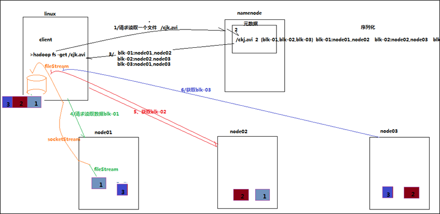 客户端将要读取的文件路径发送给namenode, namenode获取文件的元信息(主要是blocak的存放位置信息)返回给客户端,客户端根据返回的信息找到相应datanode逐个获取文件的blocak并在客户端本地进行数据追加合并从而获得整个文件。