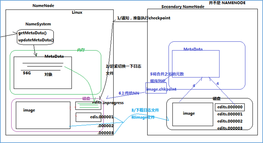 元数据的checkpoint:每隔一段时间,会由secondary namenode 将namenode上积累的所有edits和一个最新的fsimage下载到本地,并加载到内存进行merge(这个过程称为checkpoint).namenode和secondary namenode的工作目录存储结构完全相同,所以,当namenode故障退出需要重新恢复时,可以从secondary namenode的工作目录中将fsimage拷贝到namnode的工作沐浴露,以恢复namenode的元数据。