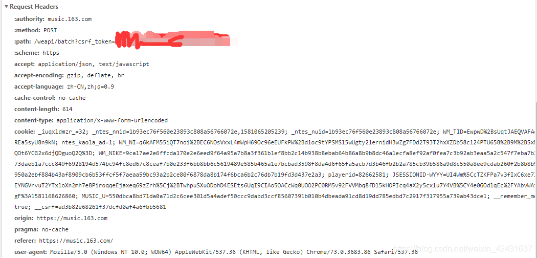 'Cookie': '_iuqxldmzr_=32; _ntes_nnid=1b93ec76f560e23893c808a56766072e,1581065205239; _ntes_nuid=1b93ec76f560e23893c808a56766072e; WM_TID=EwpwD%2BsUqtJAEQVAFAd6REa5syU8n9kN; ntes_kaola_ad=1; WM_NI=q6kAFM55iQT7noi%2BEC6NOsVxxL4mWpH69Oc96eEUFkPW%2Bd1oc9tYPSMSl5wUgty21ernidH3wZg7FDd2T93T2hxXZDb58c124PTU658%2B9M%2BSxMnQOt6YCG2x6djQDguoQ2Q%3D; WM_NIKE=9ca17ae2e6ffcda170e2e6eed9f64a95a7b8a3f361b1ef8bb2c14b938b8ebab64b86a8b9b8dc46a1ecfa8ef92af0fea7c3b92ab3eaa5a2c547f7eba7b2d73daeb1a7ccc849f6928194d574bc94fc8ed67c8ceaf7b0e233f6bb8bb6c5619489e585b465a1e7bcbad3598f8da4d6f65fa5acb7d3b46fb2b2a785cb39b586a9d8c550a8ee9cdab260f2b8b8b9d950a2ebf884b43af8909cb6b53ffcf5f7aeaa59bc93a2b2ce80f6878da8b174f6bca6b2c76db7b19fd3d437e2a3; playerid=82662581; JSESSIONID-WYYY=UI4Wm%5CcTZKFPa7v3fIxC6xe73zEYNGVrvuT2YTxloXn2mh7e8PiroqqeEjaxeq69zZrh%5Cj%2BTwhpuSXuODohD4ESEts6UqI9CIAo5OACcWq0UOO2PC0RM5v92FVVMbq8fDl5kHOPIcq4aX2y5cx1u7Y4VB%5CY4e0GOdlqEc%2FYAbvWAzegF%3A1581168626860; __remember_me=true; MUSIC_U=550dbca8bd71da0a71d2c6cee301d5a412521143296491e32ae91705f4fcaccac611a308532e6d6c65196b186f749e4941049cea1c6bb9b6; __csrf=11ea2c6b05d5b6dcc39f0d344bb5b190',