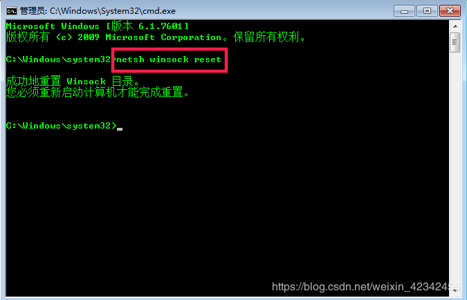 2.在cmd窗口中输入netsh winsock reset命令,作用是重置winsock网络规范