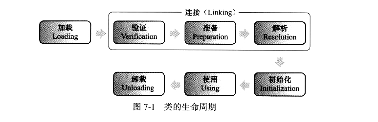 如上图所示类加载有七个阶段,其中验证,准备,解析统一为链接阶段。