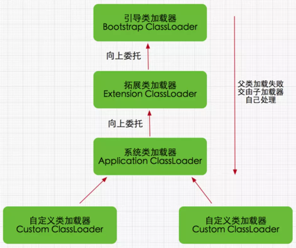 收到请求后先用父类加载器加载,父类也是找父类,所以一个对象最终都是由启动类加载器先加载,除非获取不到再自己加载。