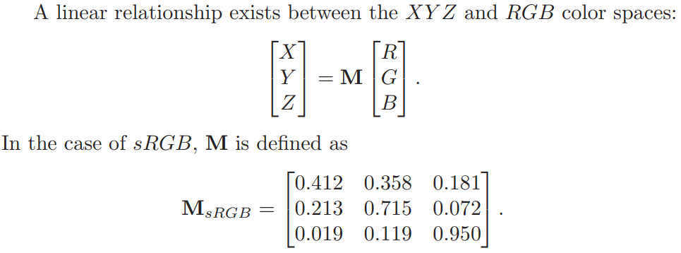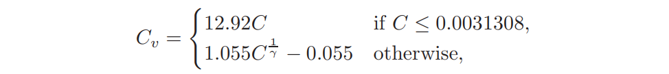 where C is a color channel, γ = 2.4, and the subscript v means that the color channel is ready for visualization. Note that this equation has been derived from the gamma correction: