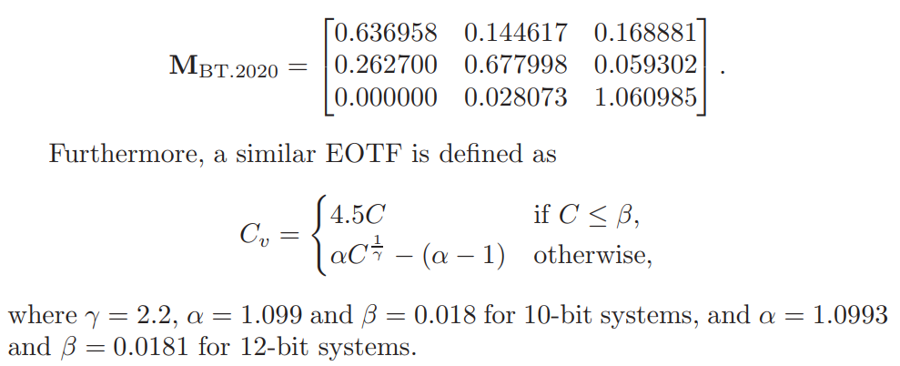 在高清电视中,ITU-R BT.2020给出了更宽的sRGB颜色范围,相应地,公式参数也有所不同。