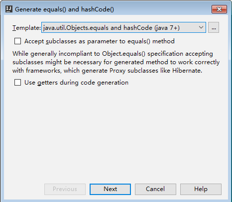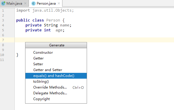 这段代码充分考虑了对象为空、类型一致等问题,但方法内容并不唯一。大多数IDE都可以自动生成equals方法的代码内容。在IntelliJ IDEA中,可以使用Code菜单中的Generate…选项,也可以使用快捷键alt+insert,并选择equals() and hashCode()进行自动代码生成。如下图所示: