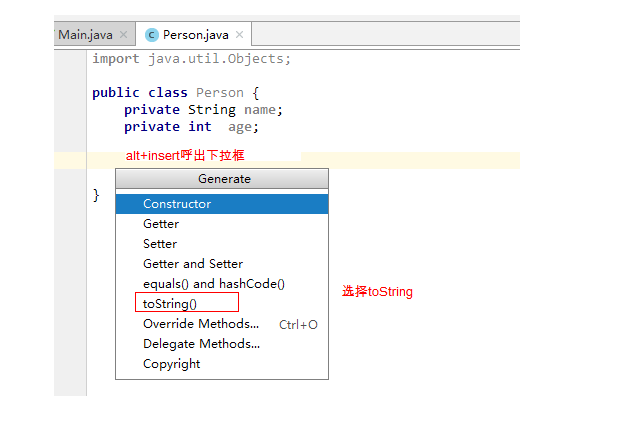 在IntelliJ IDEA中,可以点击Code菜单中的Generate...,也可以使用快捷键alt+insert,点击toString()选项。选择需要包含的成员变量并确定。如下图所示: