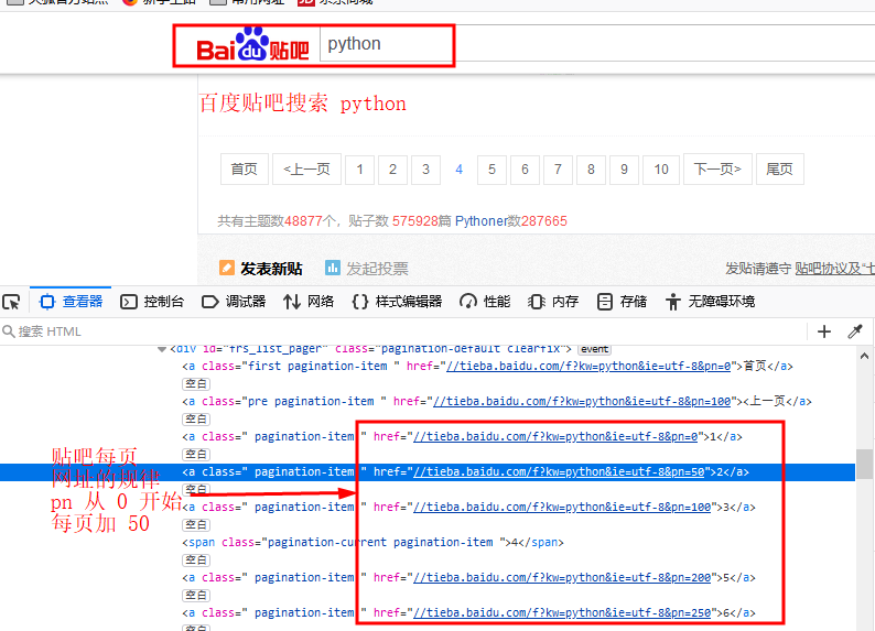 1、打开百度贴吧,输入 python ,在 html 查看器中查找规律,贴吧网址pn 每页从 0 开始,每页 50,如下图