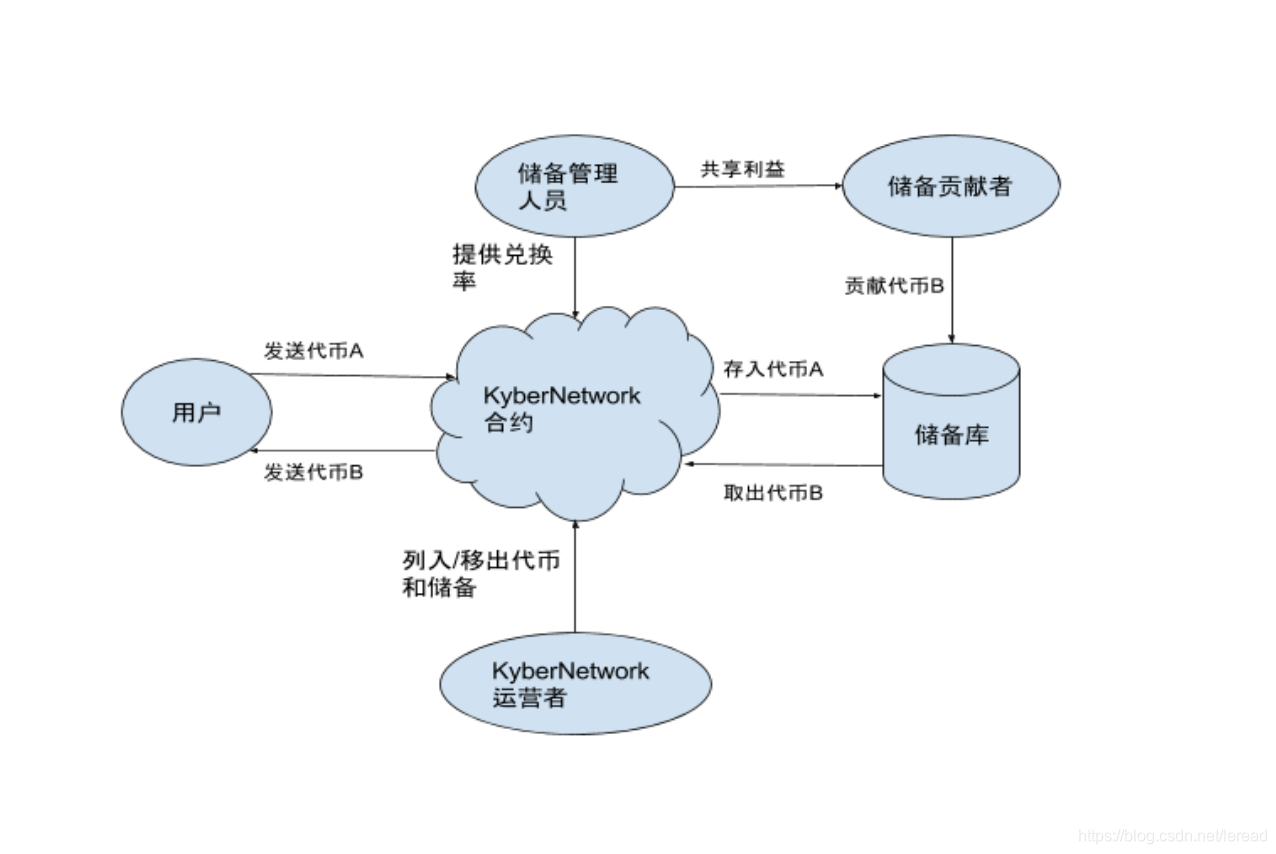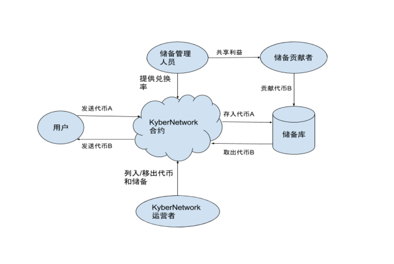 5. KyberNetwork 运营者,负责在网络中添加、删除储备实体以及将代币对列入/移出交易列表。Kyber 团队将作为初始运营者引导平台的早期发展。后期将设置去中心化的管理来接替团队的运营者角色。每一位参与者都以不同的方式独立地与智能合约交互。