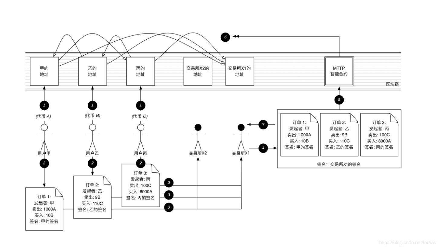 3.甲、乙、丙分别将自己的订单通过适当的方式发送到一个或多个交易所;