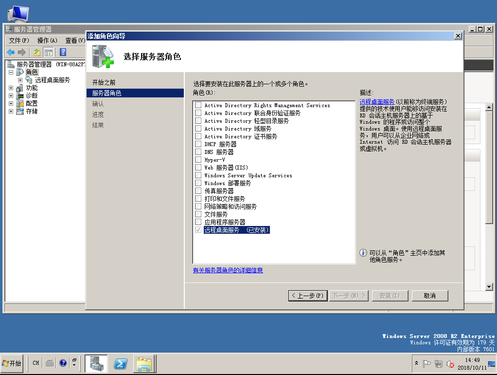 0、目标主机Windows Server 2008 r2先要安装远程桌面服务