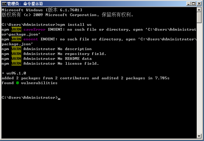 C:\Users\Administrator>npm install ws