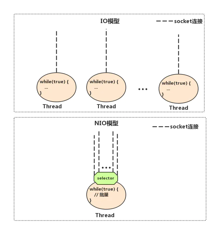 NIO编程模型中,新来一个连接不再创建一个新的线程,而是可以把这条连接直接绑定到某个固定的线程,然后这条连接所有的读写都由这个线程来负责,那么他是怎么做到的?我们用一幅图来对比一下IO与NIO