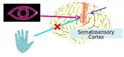 神经系统科学家做了下面这个有趣的实验,把耳朵到听觉皮层的神经切断。在这种情况下,将其重新接到一个动物的大脑上,这样从眼睛到视神经的信号最终将传到听觉皮层。如果这样做了。那么结果表明听觉皮层将会学会“看”。这里的“看”代表了我们所知道的每层含义。所以,如果你对动物这样做,那么动物就可以完成视觉辨别任务,它们可以看图像,并根据图像做出适当的决定。它们正是通过脑组织中的这个部分完成的。下面再举另一个例子,这块红色的脑组织是你的躯体感觉皮层,这是你用来处理触觉的,如果你做一个和刚才类似的重接实验,那么躯体感觉皮层也能学会“看”。这个实验和其它一些类似的实验,被称为神经重接实验,从这个意义上说,如果人体有同一块脑组织可以处理光、声或触觉信号,那么也许存在一种学习算法,可以同时处理视觉、听觉和触觉,而不是需要运行上千个不同的程序,或者上千个不同的算法来做这些大脑所完成的成千上万的美好事情。也许我们需要做的就是找出一些近似的或实际的大脑学习算法,然后实现它大脑通过自学掌握如何处理这些不同类型的数据。在很大的程度上,可以猜想如果我们把几乎任何一种传感器接入到大脑的几乎任何一个部位的话,大脑就会学会处理它。