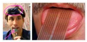 (美国食品和药物管理局)的临床试验阶段,它能帮助失明人士看见事物。它的原理是,你在前额上带一个灰度摄像头,面朝前,它就能获取你面前事物的低分辨率的灰度图像。你连一根线到舌头上安装的电极阵列上,那么每个像素都被映射到你舌头的某个位置上,可能电压值高的点对应一个暗像素电压值低的点。对应于亮像素,即使依靠它现在的功能,使用这种系统就能让你我在几十分钟里就学会用我们的舌头“看”东西。
