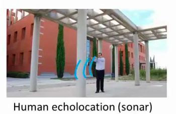 这是第二个例子,关于人体回声定位或者说人体声纳。你有两种方法可以实现:你可以弹响指,或者咂舌头。不过现在有失明人士,确实在学校里接受这样的培训,并学会解读从环境反弹回来的声波模式—这就是声纳。如果你搜索YouTube之后,就会发现有些视频讲述了一个令人称奇的孩子,他因为癌症眼球惨遭移除,虽然失去了眼球,但是通过打响指,他可以四处走动而不撞到任何东西,他能滑滑板,他可以将篮球投入篮框中。注意这是一个没有眼球的孩子。
