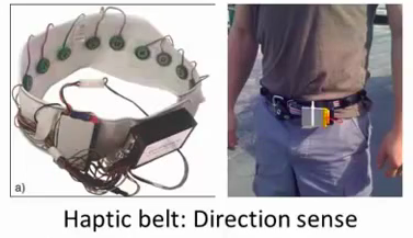 第三个例子是触觉皮带,如果你把它戴在腰上,蜂鸣器会响,而且总是朝向北时发出嗡嗡声。它可以使人拥有方向感,用类似于鸟类感知方向的方式。