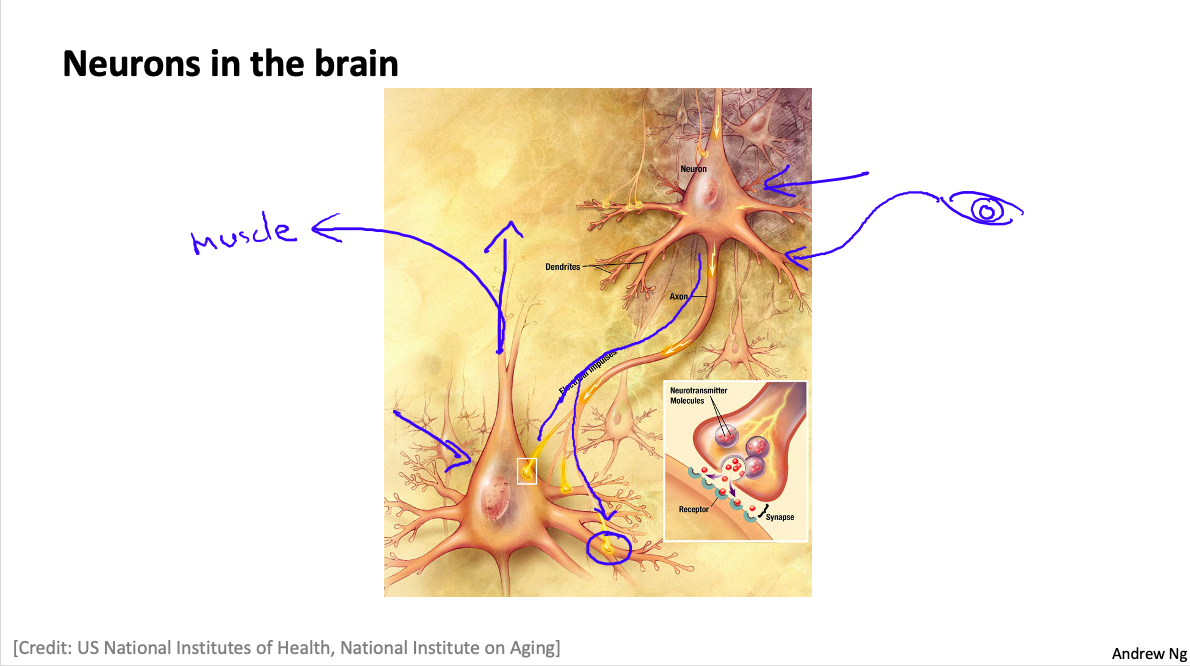 下面是一组神经元的示意图,神经元利用微弱的电流进行沟通。这些弱电流也称作动作电位,其实就是一些微弱的电流。所以如果神经元想要传递一个消息,它就会就通过它的轴突,发送一段微弱电流给其他神经元,这就是轴突。