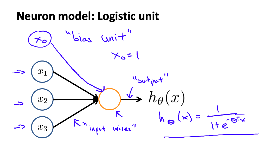 神经网络模型建立在很多神经元之上,每一个神经元又是一个个学习模型。这些神经元(也叫激活单元,activation unit)采纳一些特征作为输出,并且根据本身的模型提供一个输出。下图是一个以逻辑回归模型作为自身学习模型的神经元示例,在神经网络中,参数又可被成为权重(weight)。