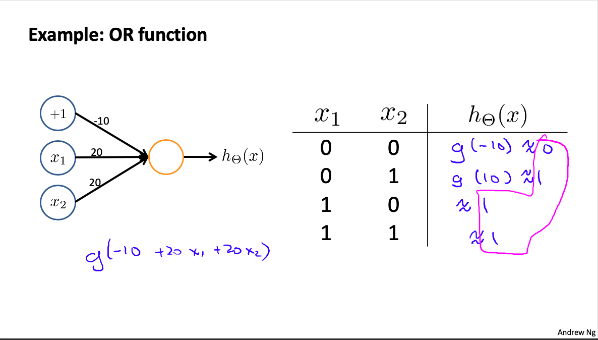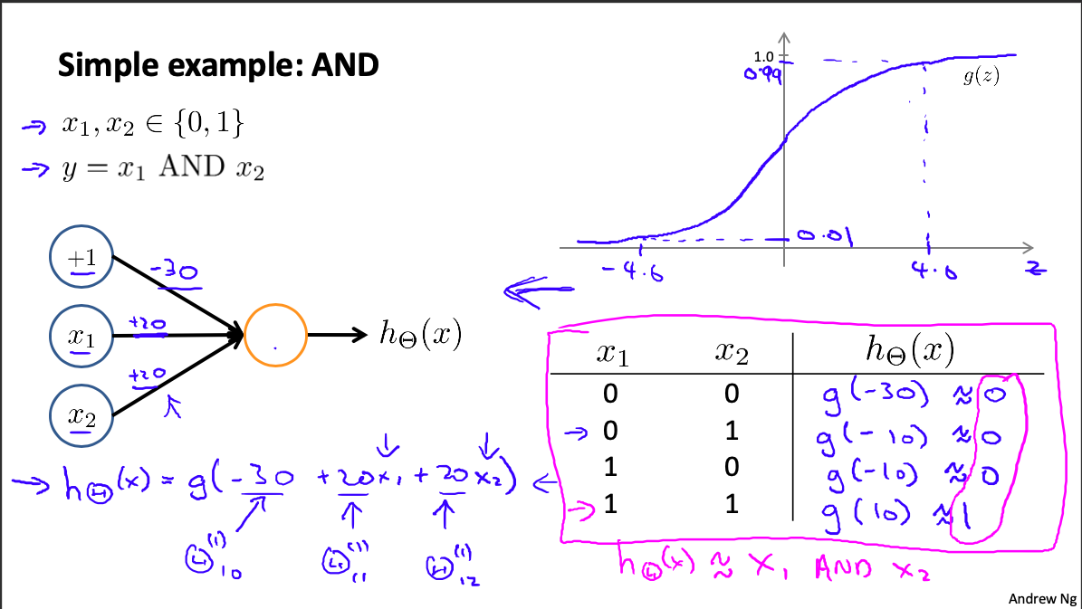 由参数可得:hθ(x)=g(−30+20x1+20x2)。