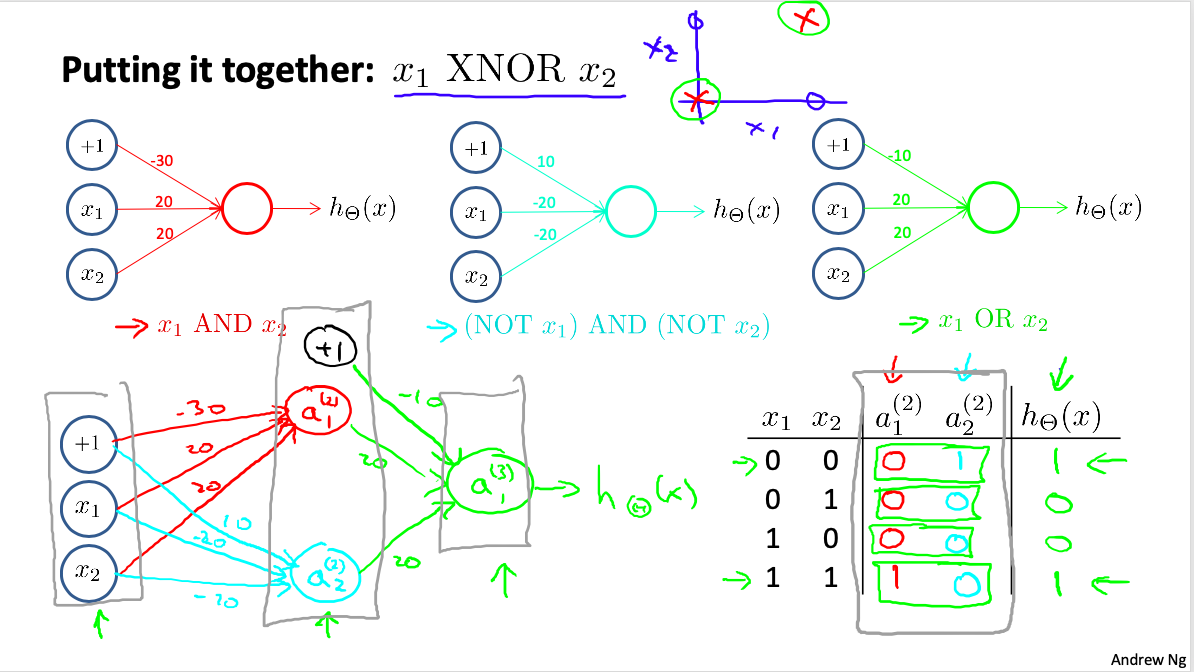 所以我们可以使用还有隐藏层的神经网络来表示XNOR。