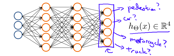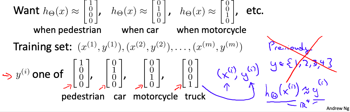 当我们有不止两种分类时(也就是y=1,2,3….),比如以下这种情况,该怎么办?如果我们要训练一个神经网络算法来识别路人、汽车、摩托车和卡车,在输出层我们应该有4个值。例如,第一个值为1或0用于预测是否是行人,第二个值用于判断是否为汽车