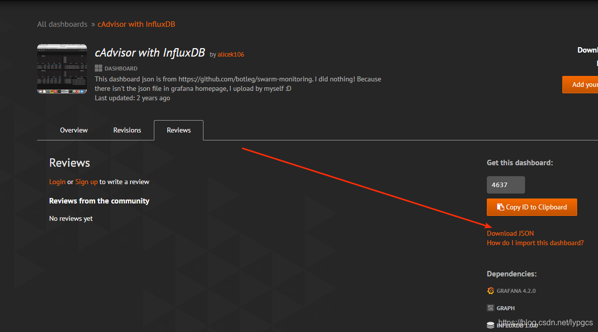 - 首先打开grafana的dashboard市场下载模版https://grafana.com/grafana/dashboards/4637/reviews