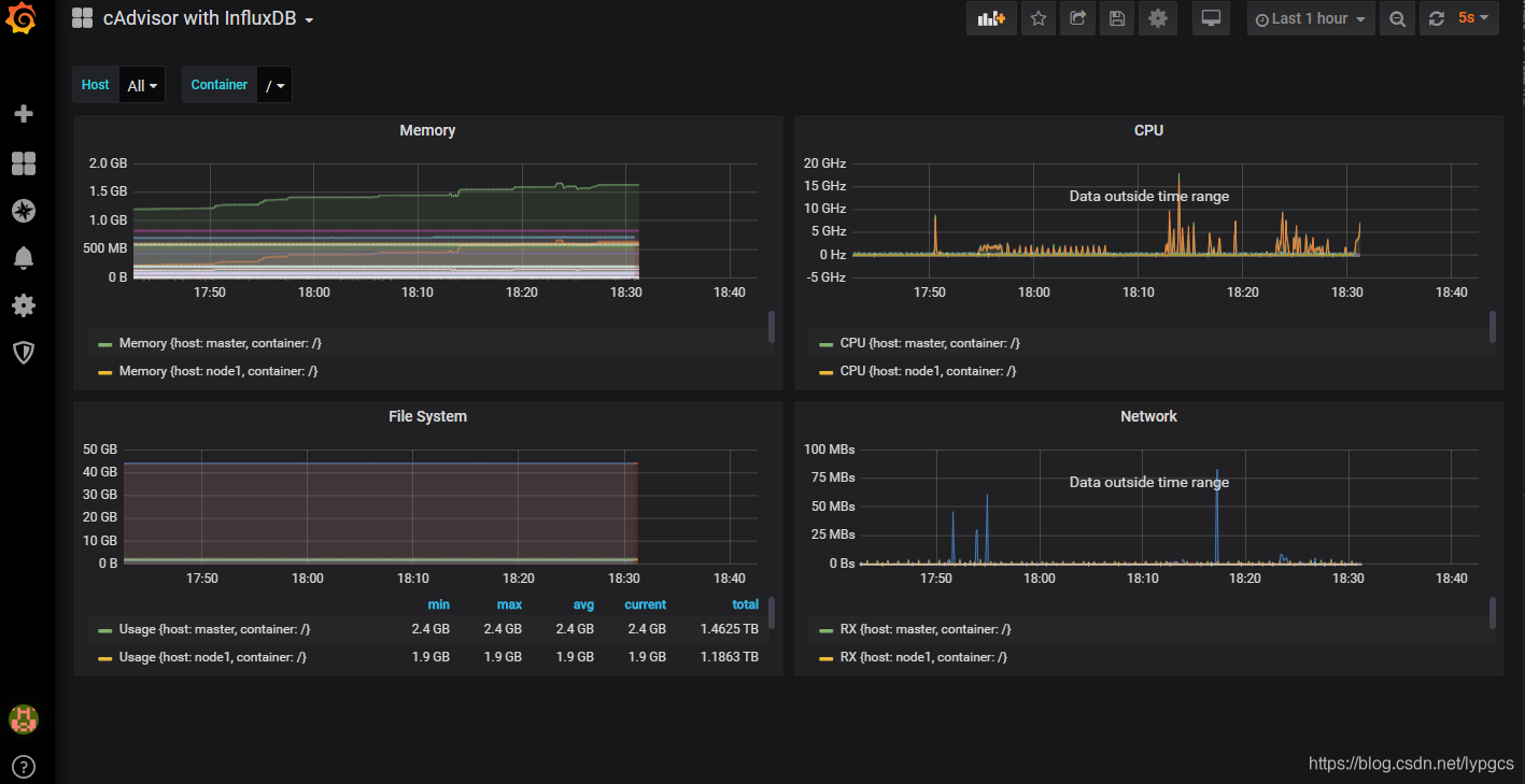 到目前为止,服务已经部署完成了,三台机器各自部署一个cadvisor,在master节点部署了grafana和influxdb