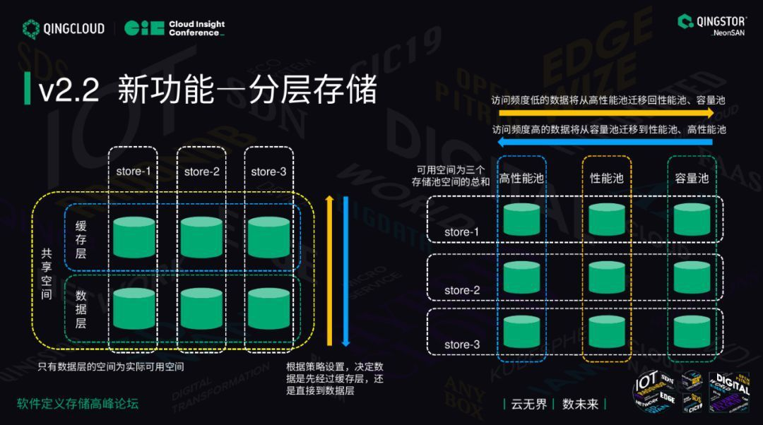 NeonSAN®️ 在不断发布新的版本,做一些新特性的增强。上图左是我们现有的存储方案,采用共享存储的方式。底层是数据层一般会采用机械盘,如 SAS 或者 SATA,上层缓存层可能会使用 NVMe SSD、SATA SSD 等技术。作为总体空间对外提供服务,它的可用空间仅仅局限于数据层,缓存层只是做缓存,数据存在里面会不断地搬移到底层。