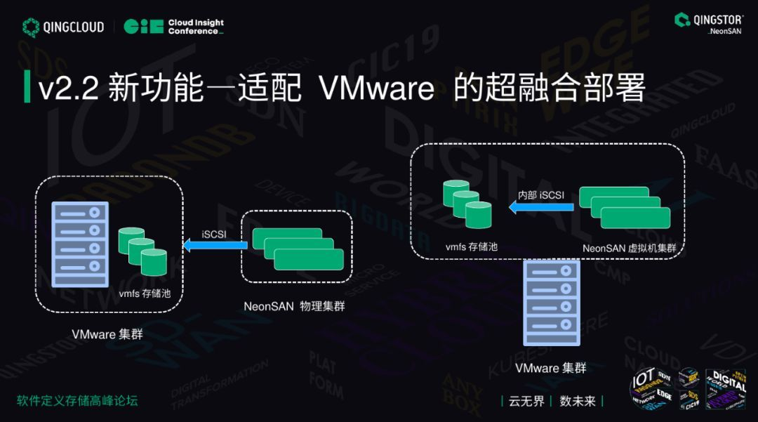 我们最近发布了另一个新方案,能够与 VMWare 宿主机采用融合部署的方式。它类似于 VSAN 的架构,在一个机器上装好 VMWare 操作系统,同时部署 NeonSAN®️ 软件,作为数据盘对 VMWare 提供服务,这类似于青云的计算存储融合架构,在同一个节点上同时提供计算服务和存储服务。