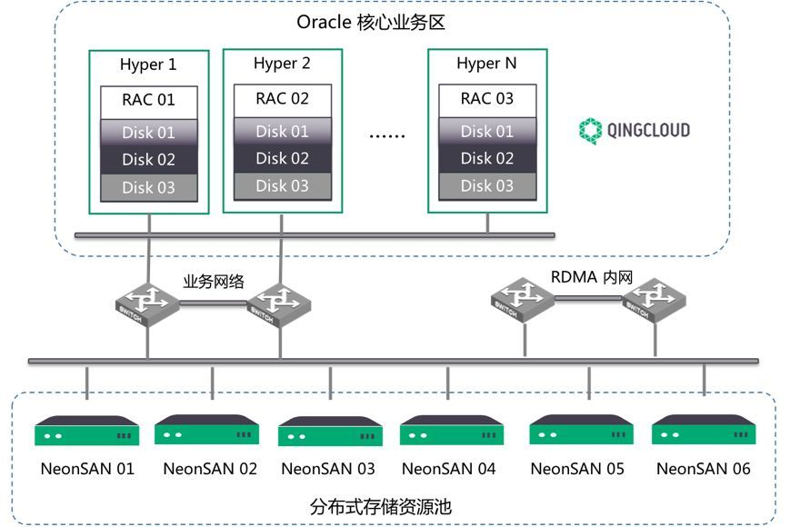 NeonSAN®️ 是青云全自研的一款软件定义分布式块存储产品,支持 HDD、SATA SSD、NVMe SSD 乃至 Intel Optane 等多种存储介质,并可选 10GbE 或新一代 25GbE 网络,通过不同的硬件组合,能够为不同应用场景下的不同存储性能需求提供灵活选择。也能根据应用特点融合部署在虚拟化环境(HCI),或者分离部署在 x86 服务器之上(Server SAN),Oracle RAC、SQL Server 等核心数据库集群、物理机高可用架构、容器持久化存储、大数据分析计算等应用场景都有相匹配的 NeonSAN®️ 产品。