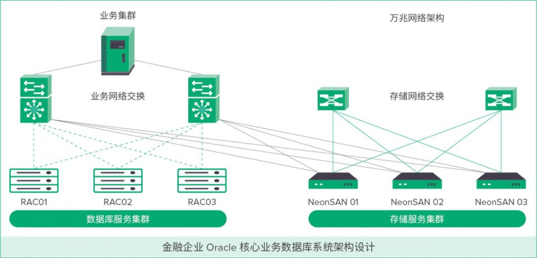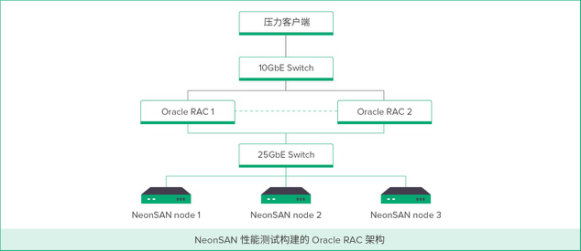 E 企研究院根据企业关键应用的特点,使用 x86 服务器、Intel NVMe SSD 和 25GbE 构建了 Oracle RAC 数据库环境,用以评估 NeonSAN®️ 在 OLTP 中的性能表现。