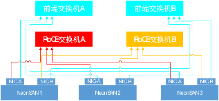 每个 NeonSAN®️ 节点都配备了 2 张双端口网卡,每个端口都连接到不同交换机上。其中互为冗余的两台前端交换机作为服务网络,即为前端应用服务器提供数据读取服务;两台支持 RDMA 技术的 25GbE 交换机作为数据网络,主要用于 NeonSAN®️ 的多副本写入等数据交换操作。