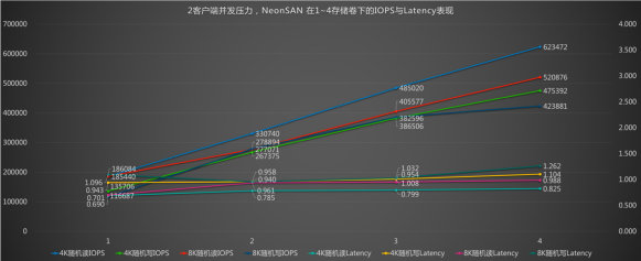 **第一部分是存储基准性能测试,**我们可以看到:随着 NeonSAN®️ 卷数量的增加,其性能线性增长,而平均响应时间的增长幅度并不明显。在单台客户端性能测试中,在配置 4 个 NeonSAN®️ 卷时,4K 随机读写和 8K 随机读性能均在 30 万 IOPS 左右,8K 随机写性能则能超过 25 万 IOPS,平均响应时间则均控制在 1ms 以内。